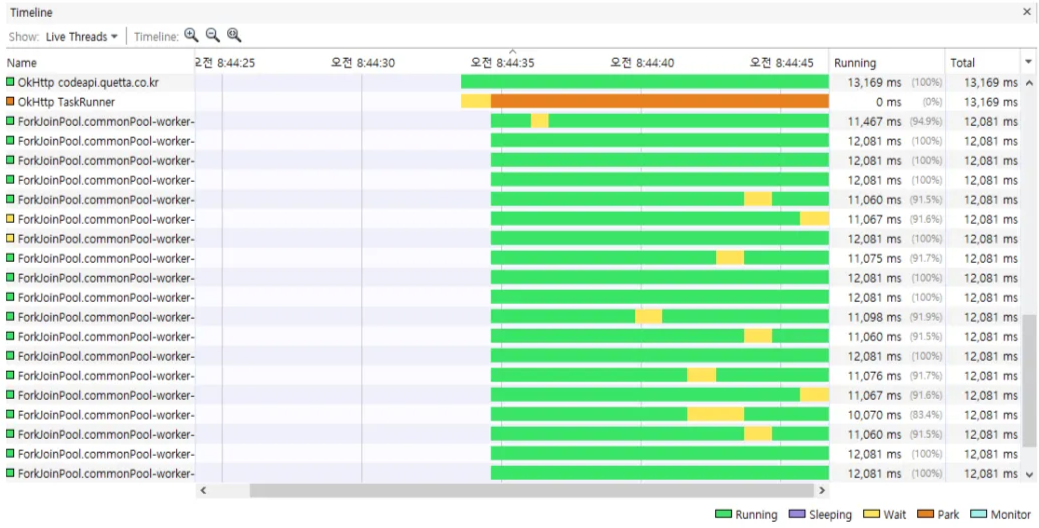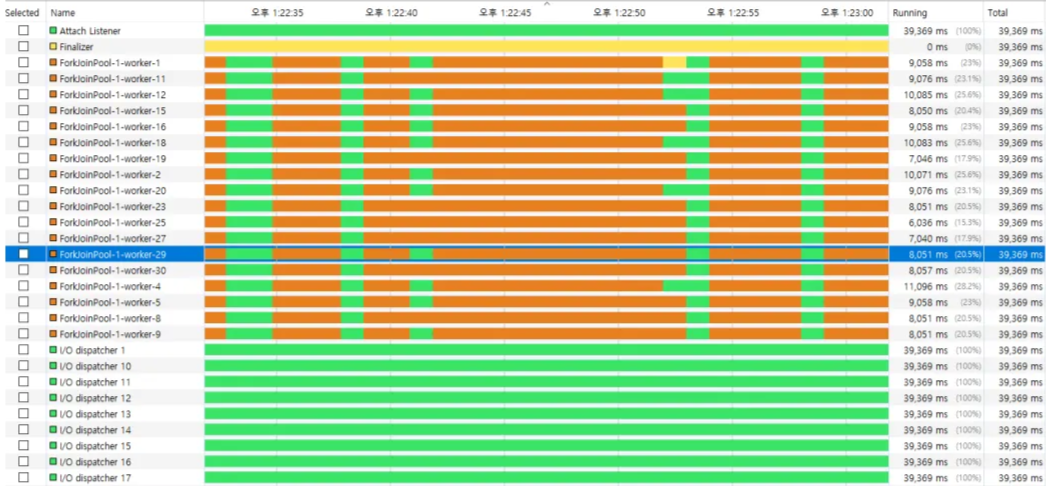 하지만 모니터링을 보며 의아했던 점은 worker Thread Running time 입니다.