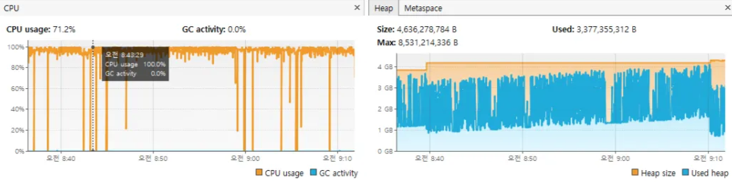 시스템 부하를 고려하지 않았을 때는 초반 Used Heap 사이즈가 3GB를 가볍게 넘었었지만 작업량 관리 코드를 추가함으로써 개선된 모습을 볼 수 있었습니다.