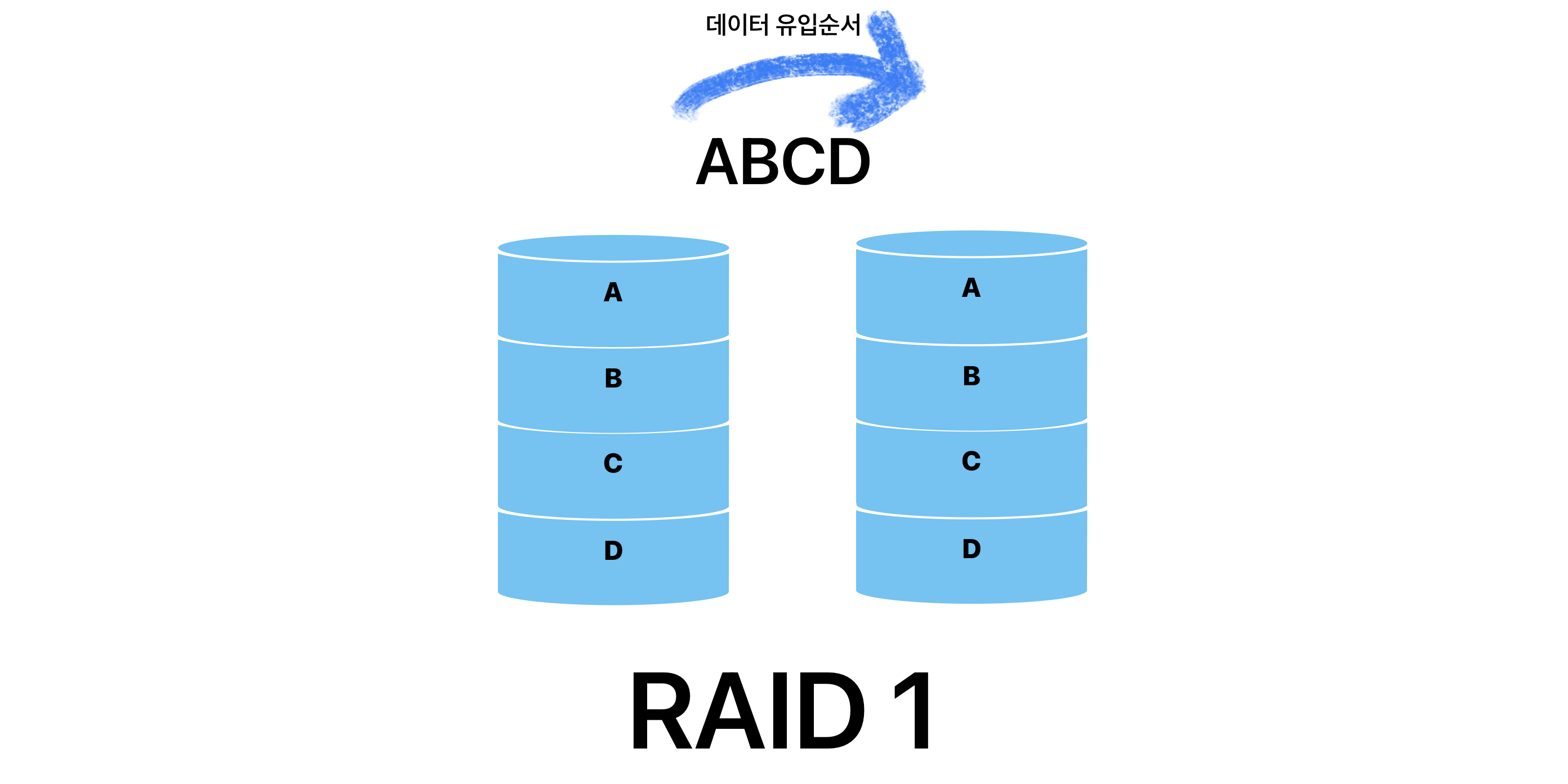 Disk 1 단순 데이터 A, B, C, D를 디스크에 저장한다고 한다면 위 그림의 Disk1 처럼 디스크에 차곡차곡 쌓이게 될 것입니다.