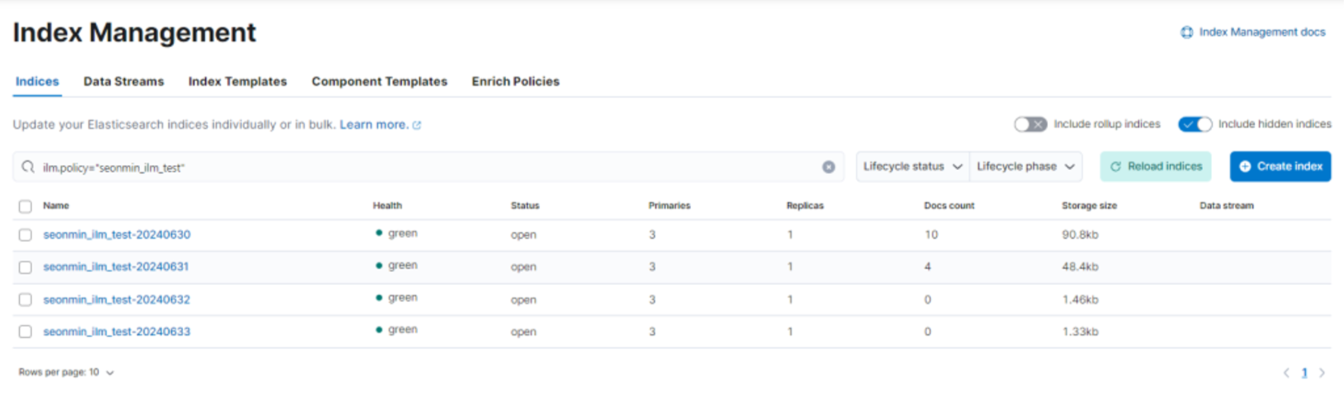 PUT _index_template/<Index Template 이름> { "index_patterns": ["hit-test-*"], "template": { "settings": { "number_of_replicas": 1, "number_of_shards": 3, "index.lifecycle.name" :<ILM_POLICY_이름>, "index.lifecycle.rollover_alias" : <rollover_별칭> } } }- "index.lifecycle.name" : <앞서 만들었던 ILM Policy>